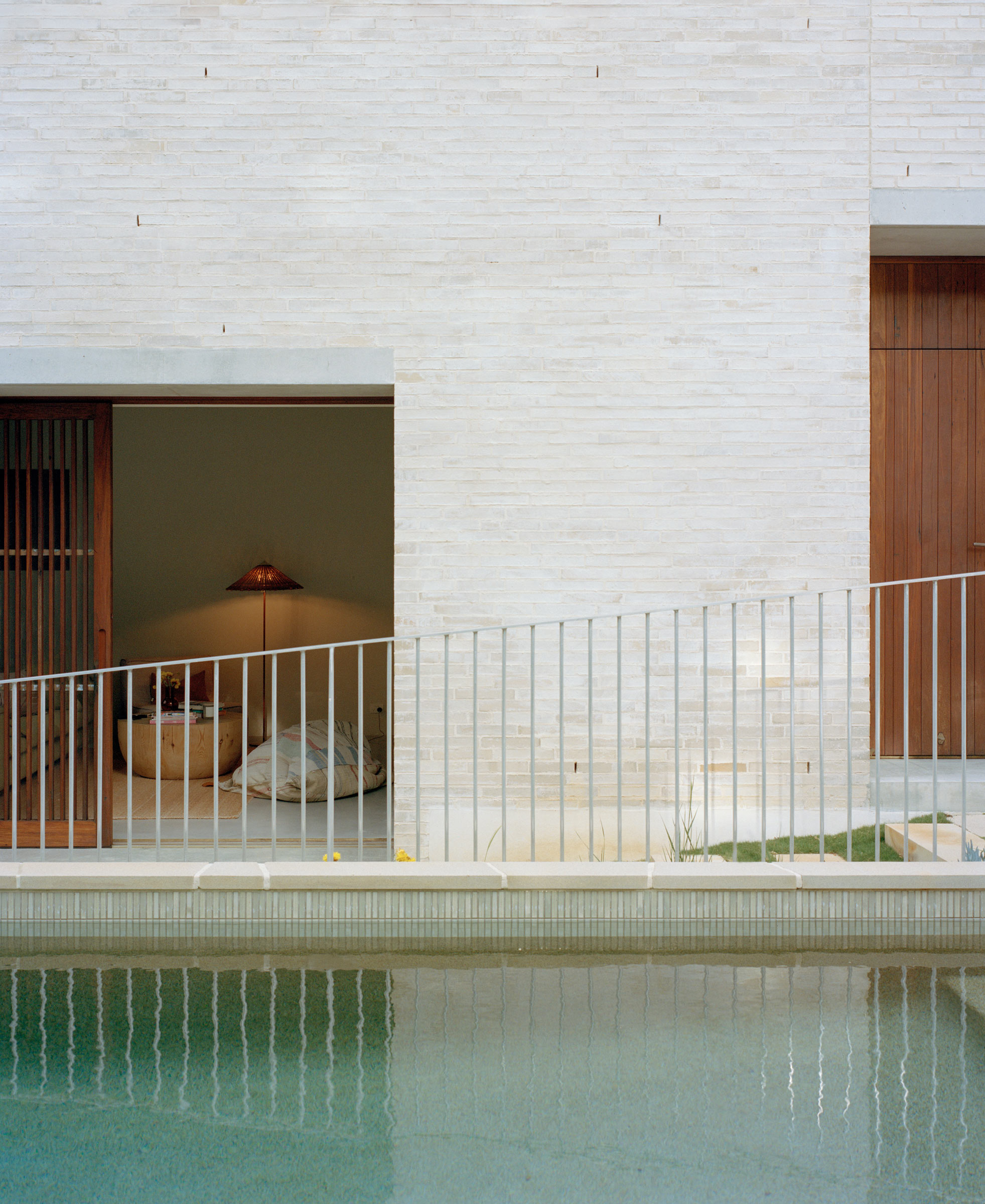 - 1. Pale brick and timber openings are reflected across the pool.